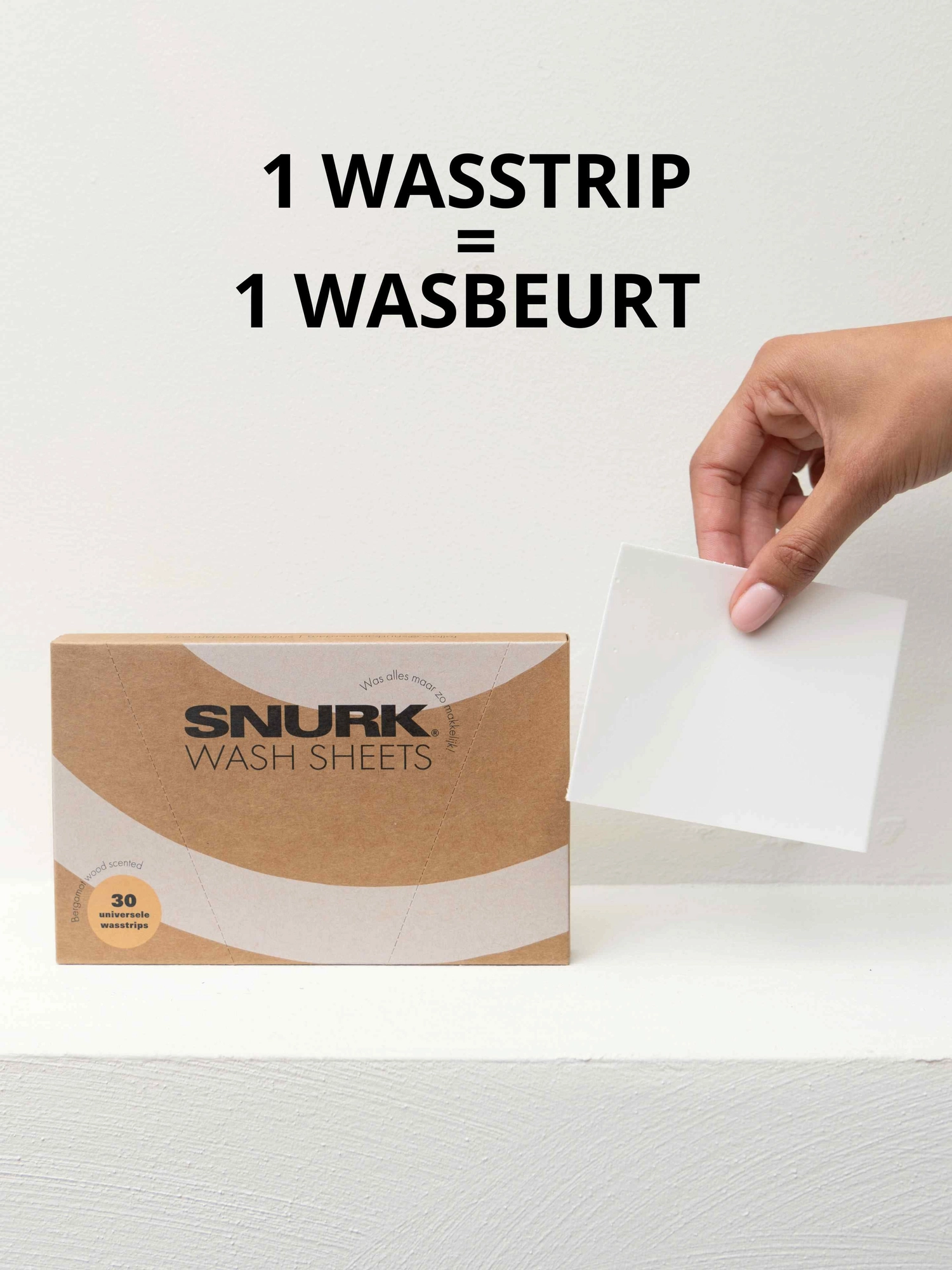 SNURK Wash Sheets is een krachtig wasmiddel waar de vloeistof uit gehaald is. Ze zijn compact en verpakt in een milieuvriendelijk kartonnen doosje. Dankzij de plantaardige en milde samenstelling blijft je was langer mooi en ruikt het heerlijk fris. Was alles maar zo makkelijk!