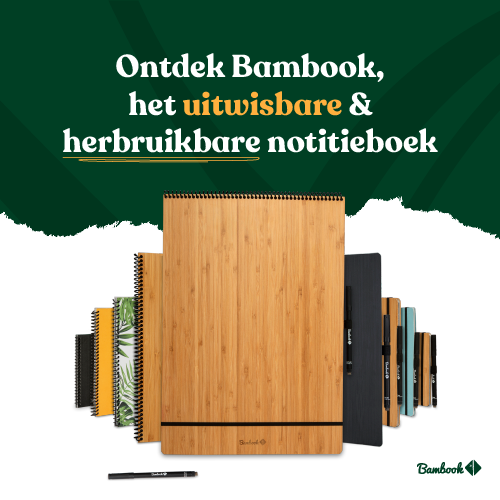 Bambook Uitwisbare notitieboeken 100% uitwisbaar en herbruikbaar. Schrijf, scan, wis, repeat. Wissen om opnieuw te gebruiken. Schrijf oneindig met Bambook Je laatste notitieboek 1 Bambook = 1 geplante boom Voorkom papierverspilling Duurzame levering Duurzame materialen Ontdek Bambook. Découvrez Bambook. Ontworpen om slimmer en duurzamer te werken. Samen op weg naar een wereld zonder papierverspilling! Ruime keuze aan stijlen, formaten en paginabedrukking. Neem jij ook afscheid van single-use papier? Strijd mee tegen ontbossing.