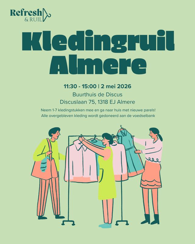 Refresh & Ruil is een gezellige en duurzame kledingruil in samenwerking met clothingloop Almere waar je jouw goed uitziende kleding een tweede leven geeft én zelf weer met “nieuwe” favoriete items naar huis gaat. Tijdens dit event staat het verlengen van de levensduur van kleding centraal: je ruilt in plaats van nieuw te kopen, waardoor we samen textielafval en de impact van fast fashion verminderen. Overgebleven kleding wordt gedoneerd aan de Voedselbank, zodat ook mensen met een kleinere portemonnee worden ondersteund en kleding terechtkomt bij mensen die het echt nodig hebben. Voor meer informatie en updates kun je terecht op Instagram via @refreshenruil.